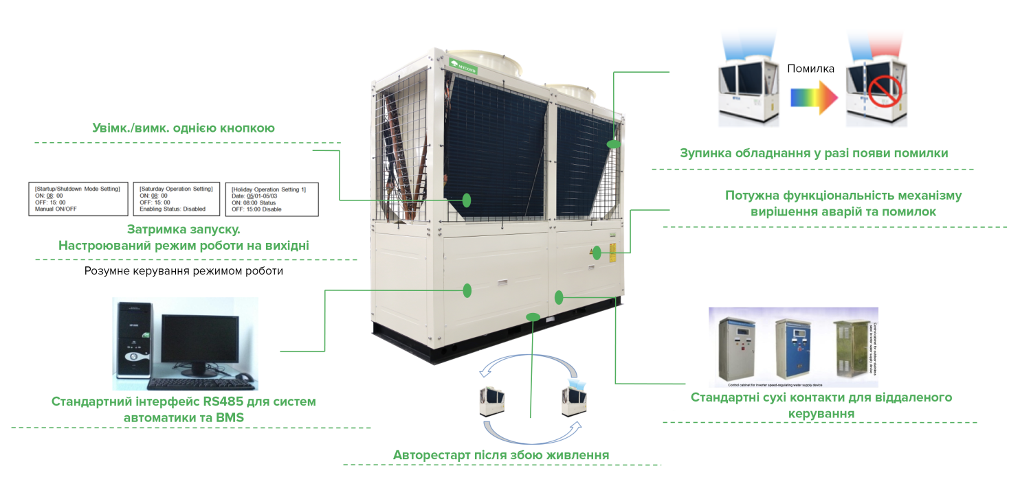 Чилер здатний працювати за температур до -15 градусів у режимі обігріву і до +48 градусів у режимі охолодження. |