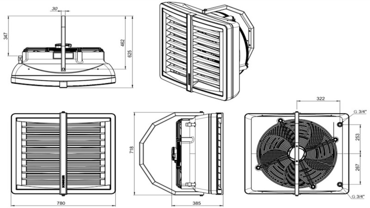 3-х ступеневий осьовий, розміром 350 мм, 450 мм або 550 мм, захищений спеціальною решіткою |