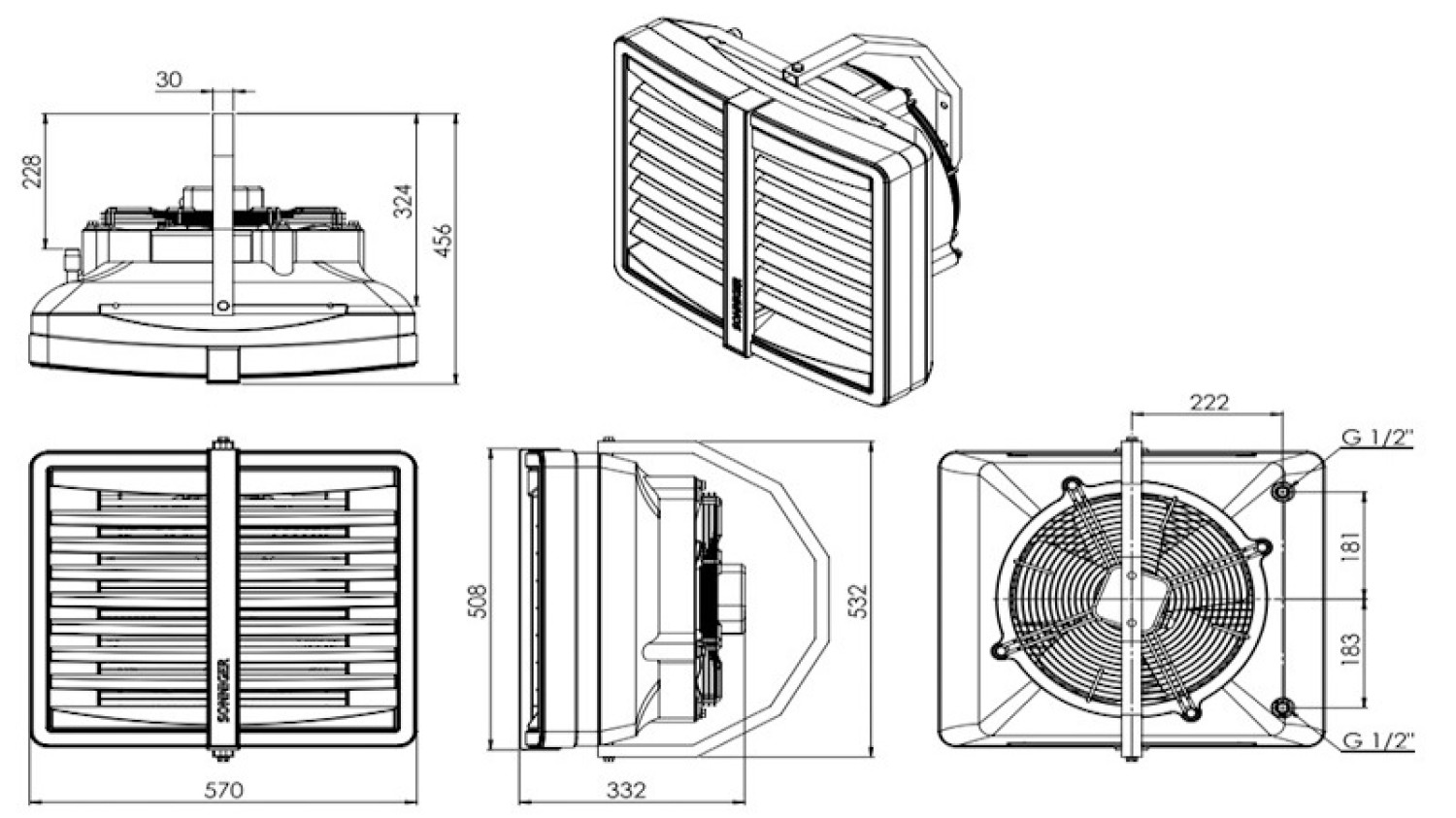 3-х ступеневий осьовий, розміром 350 мм, 450 мм або 550 мм, захищений спеціальною решіткою |
