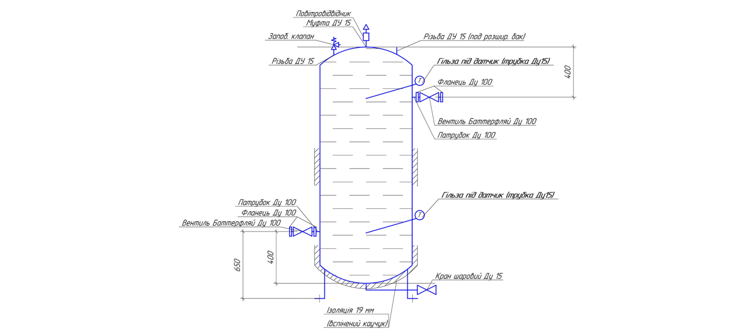 Вертикальний бак теплоакумулятор вироблений в Україні. Має такі особливості: