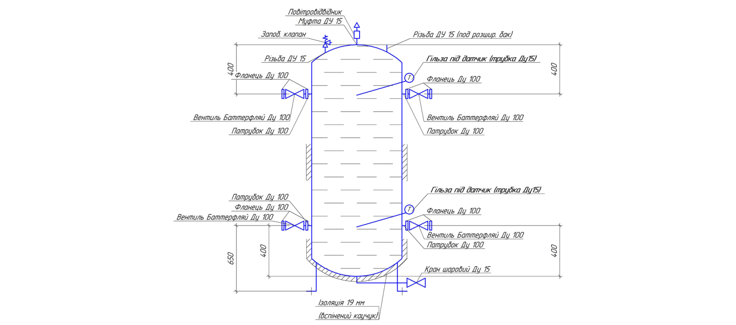 Вертикальний бак теплоакумулятор вироблений в Україні. Має такі особливості: