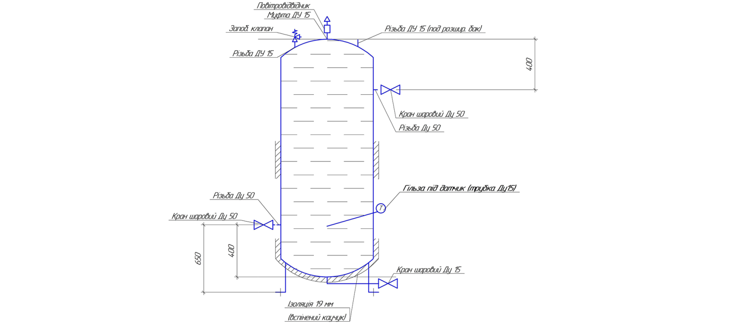 Вертикальний бак теплоакумулятор вироблений в Україні. Має такі особливості: