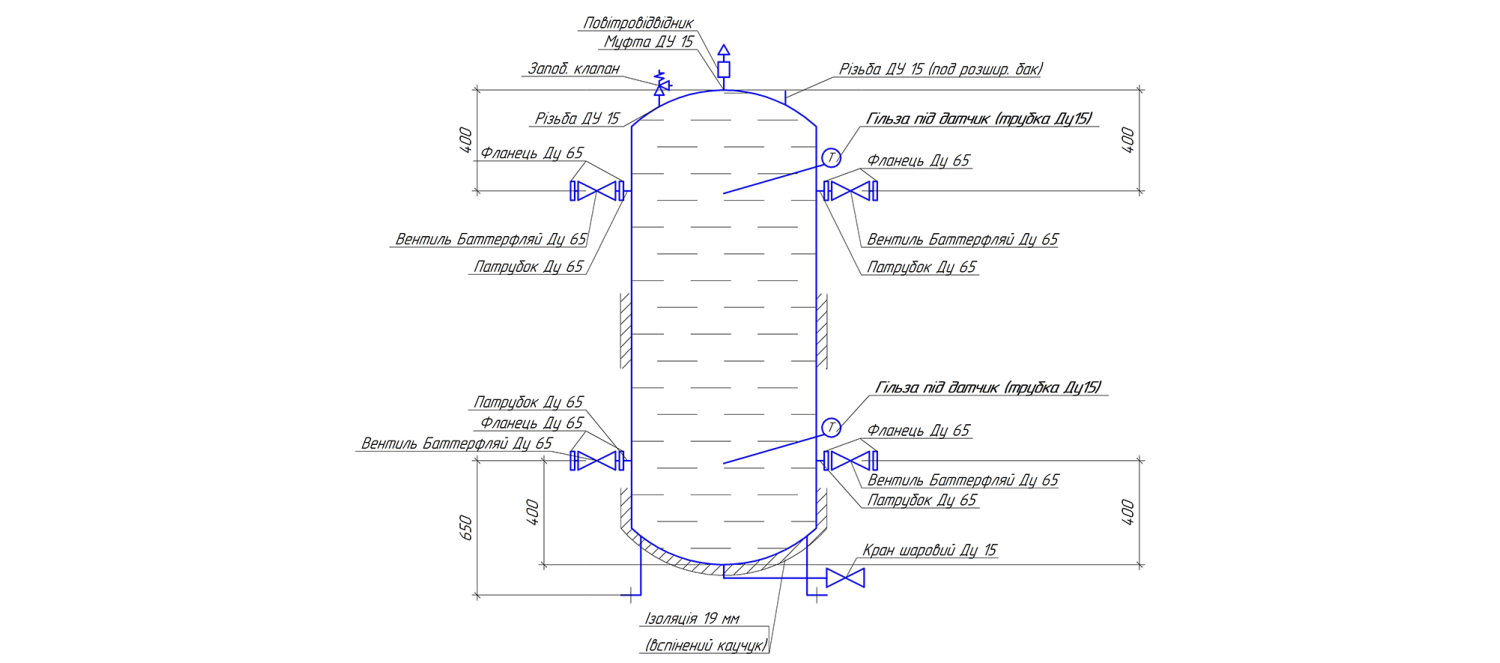 Вертикальний бак теплоакумулятор вироблений в Україні. Має такі особливості: